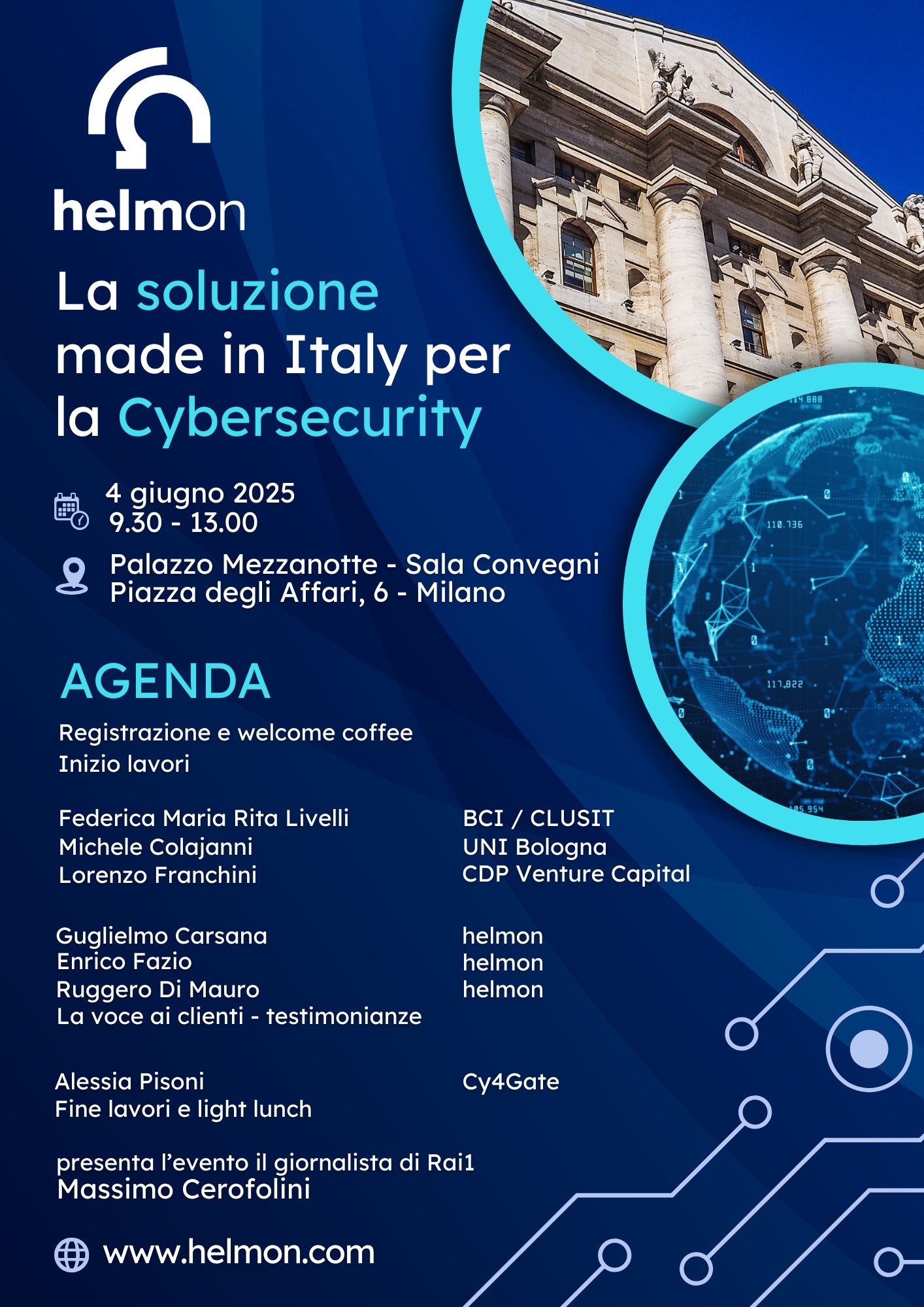 A condurre l’evento e presentare i diversi ospiti e membri del team helmon sul palco, il giornalista Rai Massimo Cerofolini, che esordisce dichiarandosi emozionato per essere nel tempio degli investimenti, la Borsa italiana, ma a parlare di tutti quegli investimenti che svaniscono per un click fatto su un link inopportuno.